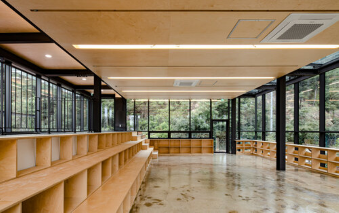 이 지역은 경관이 뛰어나다. 투명한 유리로 계획하여 외부 경관이 내부로 흐르도록 했다. 여름에는 실내가 덥다고 불평하는 사람도 있지만, 흐르는 경관이 콘셉트다. 저철분유리를 이용해 투명하게 바깥 풍경을 볼 수 있게 하고 기존의 폐쇄적인 분위기를 개방적으로 바꿨다. 기둥은 일부는 기존의 것을 탄소 섬유 보강해서 철판으로 가렸고, 일부는 보강이 필요 없어서 그대로 노출했다. 1층 남쪽 데크를 향해서는 약 2m 높이의 슬라이딩 문이 시원하게 열린다. 봄, 가을에는 완전히 열어놓고 쓸 수 있도록 했다. 2층은 증축이다. 슬래브와 철골로 증축한 부분이 드러난다. 1층과 마찬가지로 2층도 공간이 안팎으로 흐르도록, 유리로 바깥 풍경이 보이도록 했다.